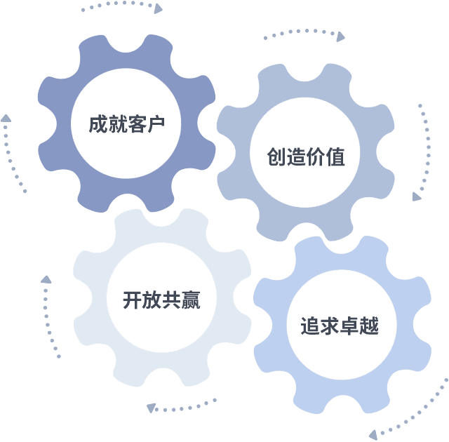 成就客户是一切决策的出发点,,创造价值是衡量所有工作的标准,,,追求卓越是我们做事做人的态度,,开放共赢是我们的格局也是最终的结果。。。。价值观的齿轮环环相扣,,,推动着组织里的每个人不断向前。。。